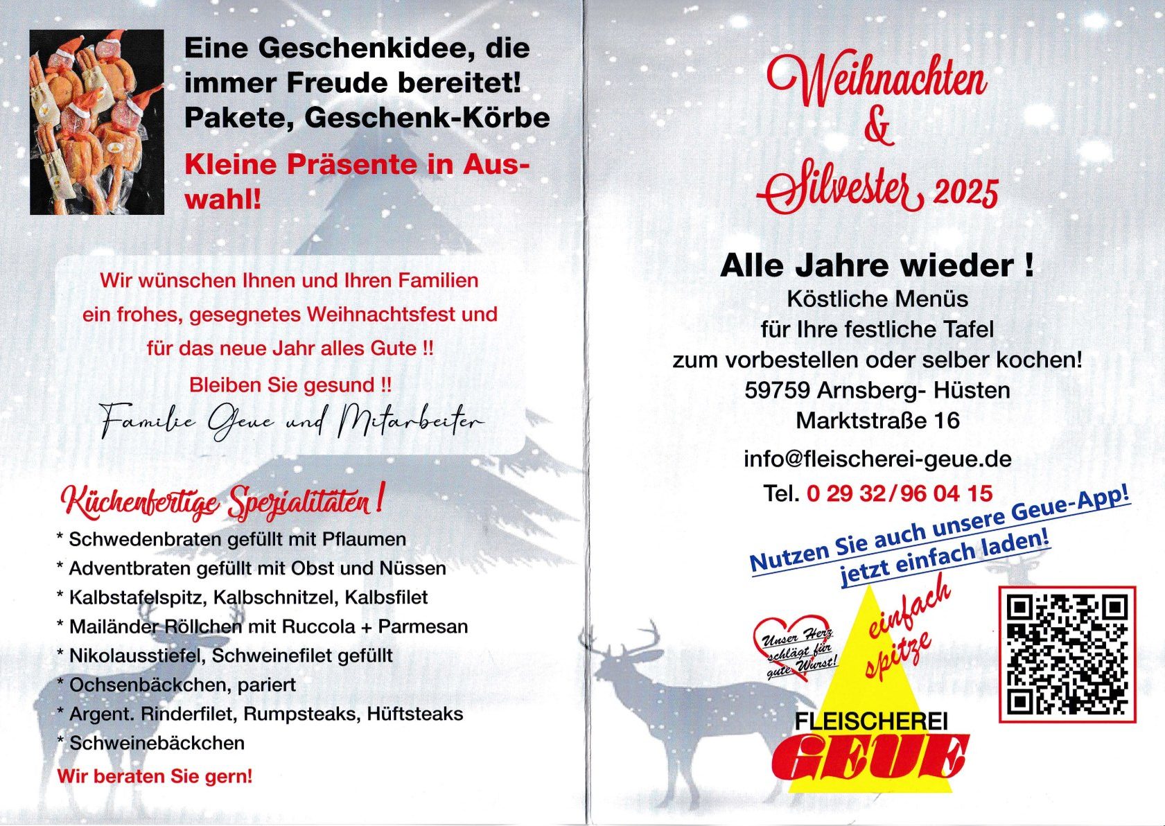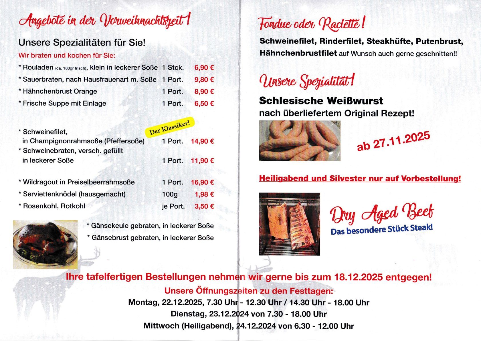 Wir verfügen über ein umfangreiches Sortiment an frischen Fleisch- und Wurstwaren und frische Salate aus eigener Herstellung.